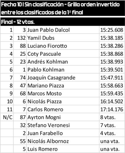 DALCOL VOLVIÓ PARA GANARLa segunda final arrancó con un dato muy importante: Stefano Veronesi, último entre los clasificados de la primera (rompió cremallera en incidente con Pablo Kohlmann, después de establecer el RdV)), heredó la pole gracias al sistema de grilla invertida, seguido por JM Farabello. Todo pintaba para que ambos pelearan adelante, pero el destino jugó en contra: Farabello abandonó tras haber liderado y, poco después, también se quedaba Veronesi (nuevamente autor del RdV), justo cuando marchaba firme en la punta.
