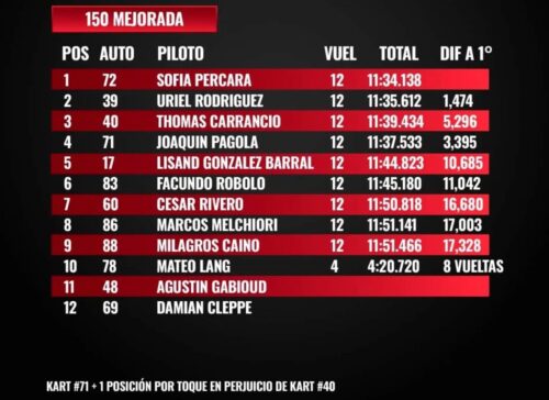 💥 UNA MEJORADA SOFÍA. La ex campeona de la 125cc Light, Sofía Percara (72), volvió a lo más alto. Con temple y velocidad, cortó la racha triunfal del líder Uriel Rodríguez. Fue una carrera tensa, táctica y precisa. Percara, con esta victoria, reaviva el fuego de la competencia. Conocido también como “Chespirito”, Uriel había sido 1 de clasifica y única serie.