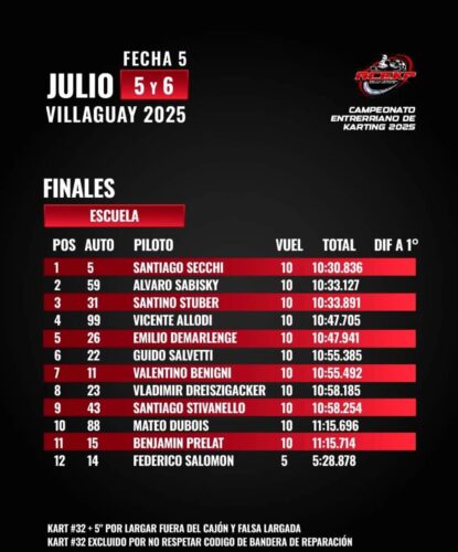 💥 ESCUELA: OTRA DE SECCHI, EL NUEVO ABANDERADO. El pequeño Santiago Secchi (5) se llevó todo en la categoría Escuela. En su Villaguay natal, ganó serie y final, y con eso llegó a los 100 puntos en el campeonato, desplazando del liderazgo a Lorenzo Piacenza. Gran tarea de Álvaro Sabisky, que fue segundo, mientras tercero era el también talentoso Santino Stüber, ganador en Paraná. El semillero mostró pilotos prometedores como Vicente Allodi, Emilio Demarlenge, Guido Salvetti (estos dos primerizos este año en Escuela), Valentino Benigni, el debutante Vladimir Dreiszigacker, Santi Stivanello y Mateo Dubois.